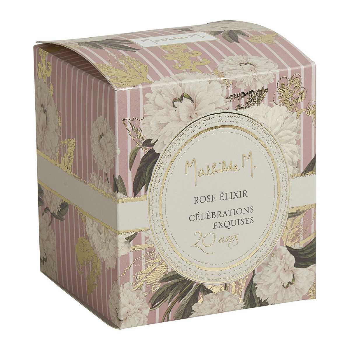Entdecken Sie die Kerze Célébrations Exquises Rose Elixir mit ihrem üppigen und betörenden Duft, der Rose und der Königin der Blumen und den pudrigen Veilchennoten auf einem Bett aus weißem Moschus.