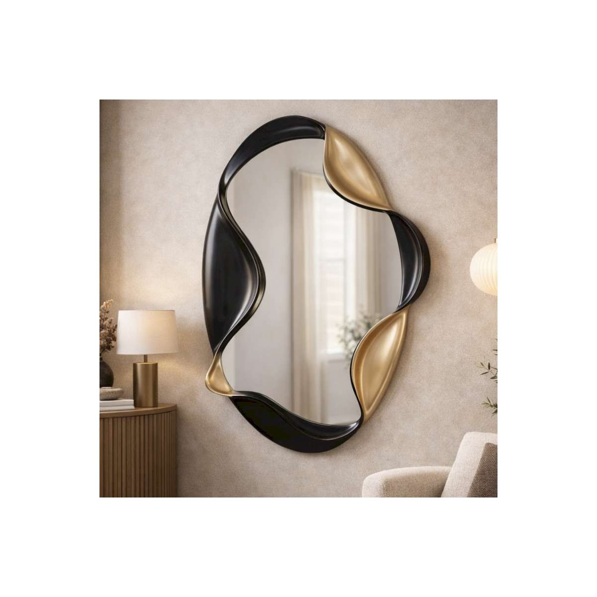 A decorative mirror with a contemporary design that elegantly combines deep black and a gold finish for a chic and sophisticated look. Its 135 cm size brings light and depth to your interior while becoming a striking decorative piece. Ideal for a living room, entryway, or bedroom, this designer mirror enhances a modern and refined interior.