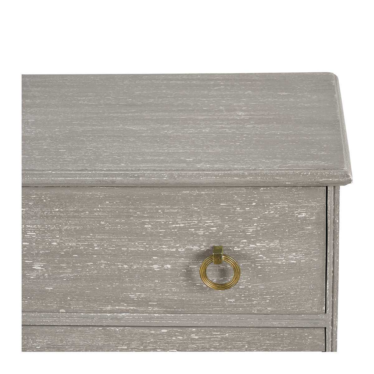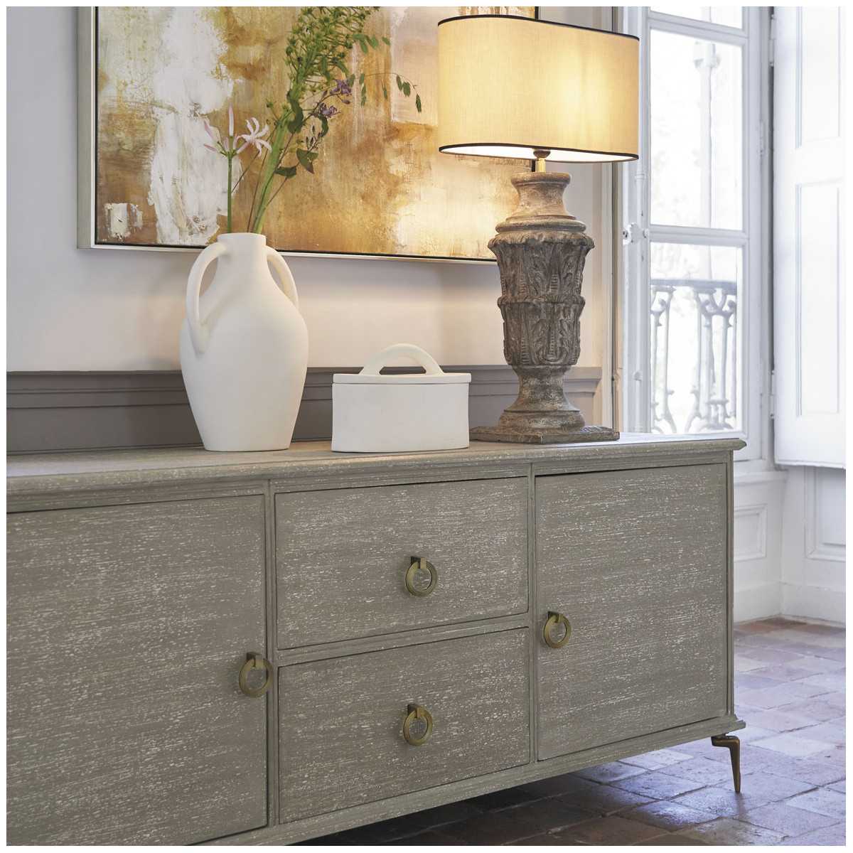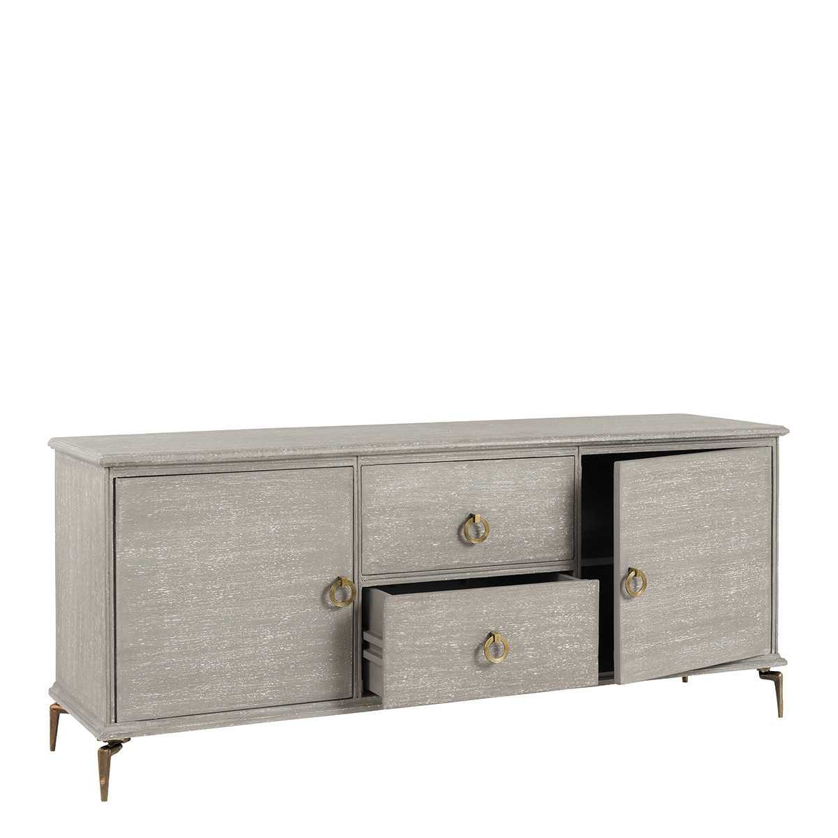 Entirely handmade, the classic curves of the GABRIELLE mango sideboard are sublimated by an artisanal gray patina and the luminous brass touches of its feet and wrists.