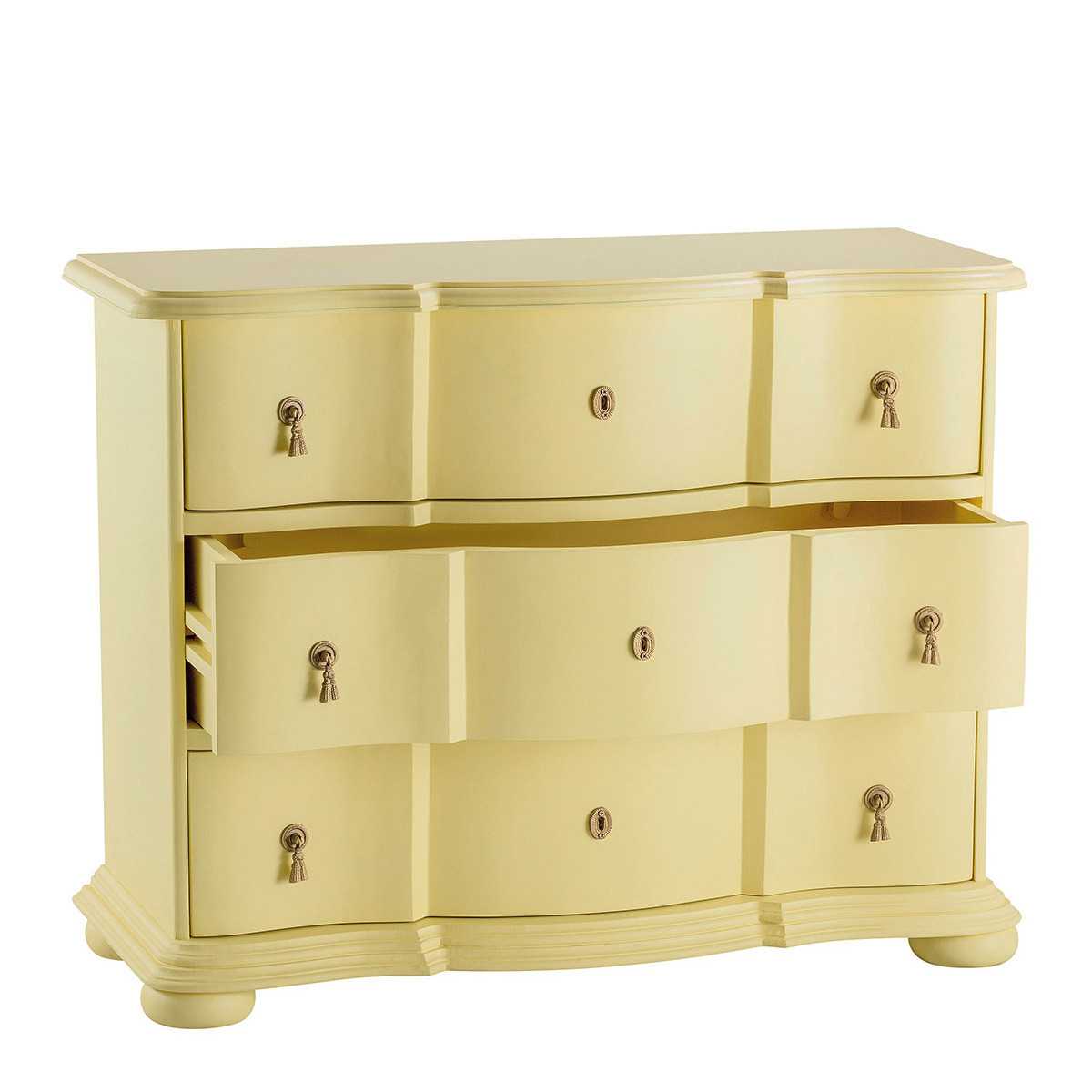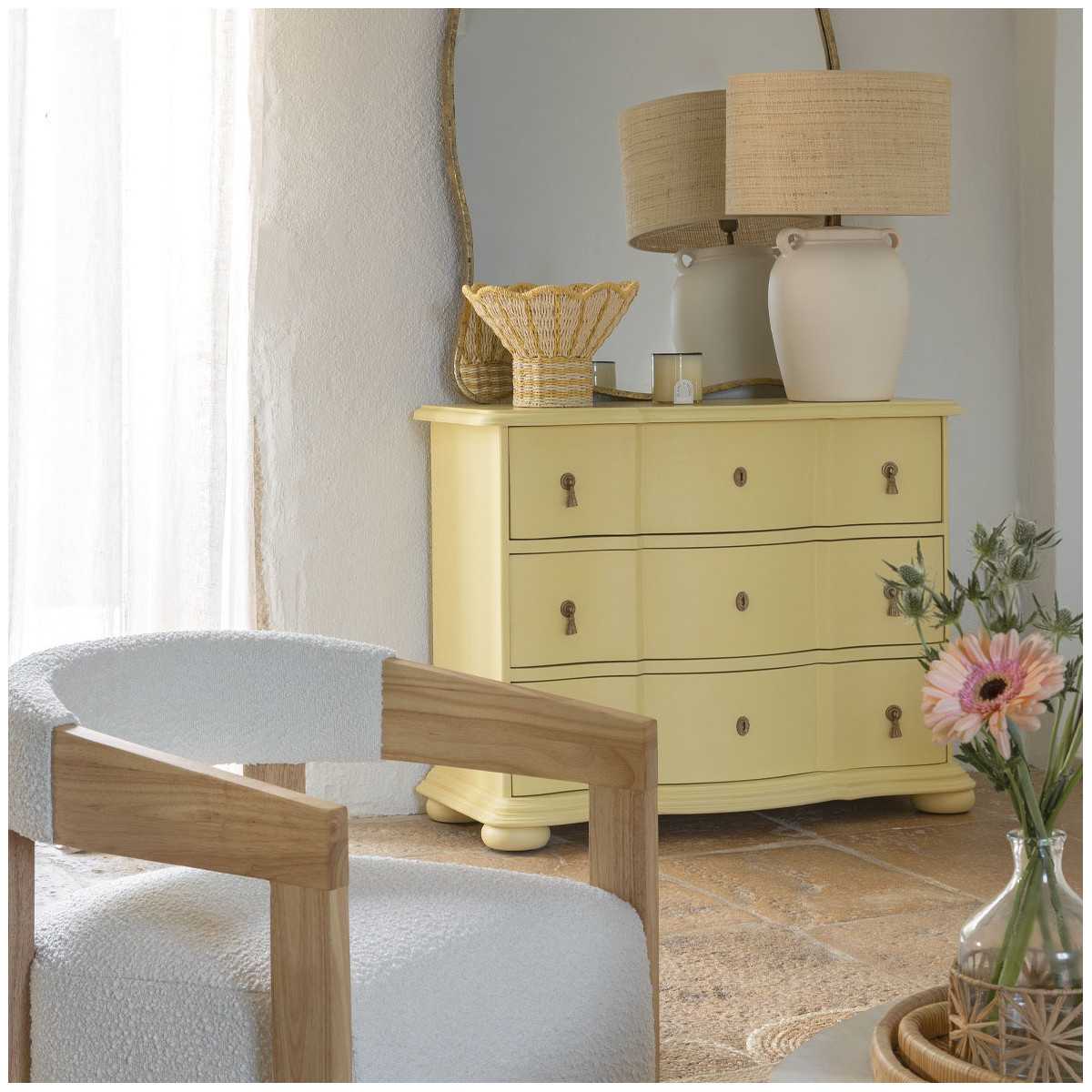Con su delicado color amarillo pastel y su diseño refinado, la cómoda CARLOTTA aporta un toque elegante a su interior. Su estilo retro revisado y sus líneas limpias lo convierten en una pieza atemporal, ideal para un dormitorio o salón. Sus tres espaciosos cajones ofrecen un almacenamiento práctico a la vez que realzan tu decoración con un toque de suavidad y modernidad. Un mueble de almacenaje pensado hasta el más mínimo detalle gracias a sus trabajados acabados.