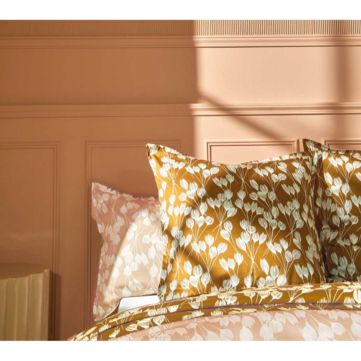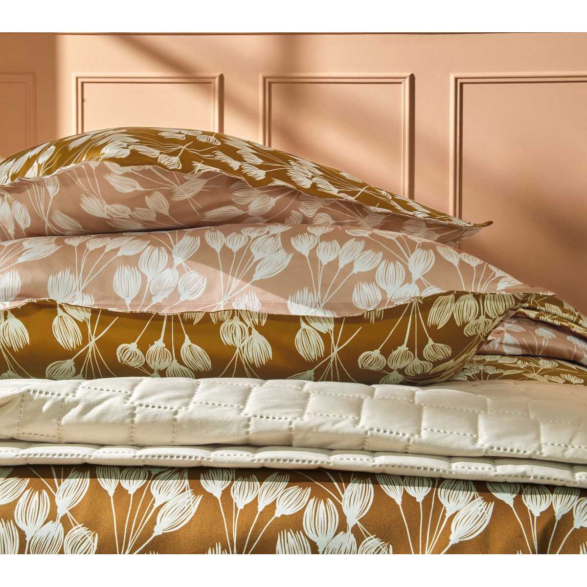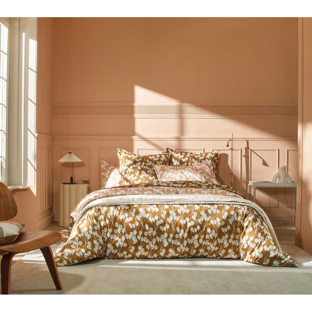 La funda nórdica ENVOLEE Copper cautiva con la elegancia de su doble estampado, transformando tu cama según tu estado de ánimo. Un remolino de estilizados tulipanes florece sobre un satén de algodón sedoso y suave.