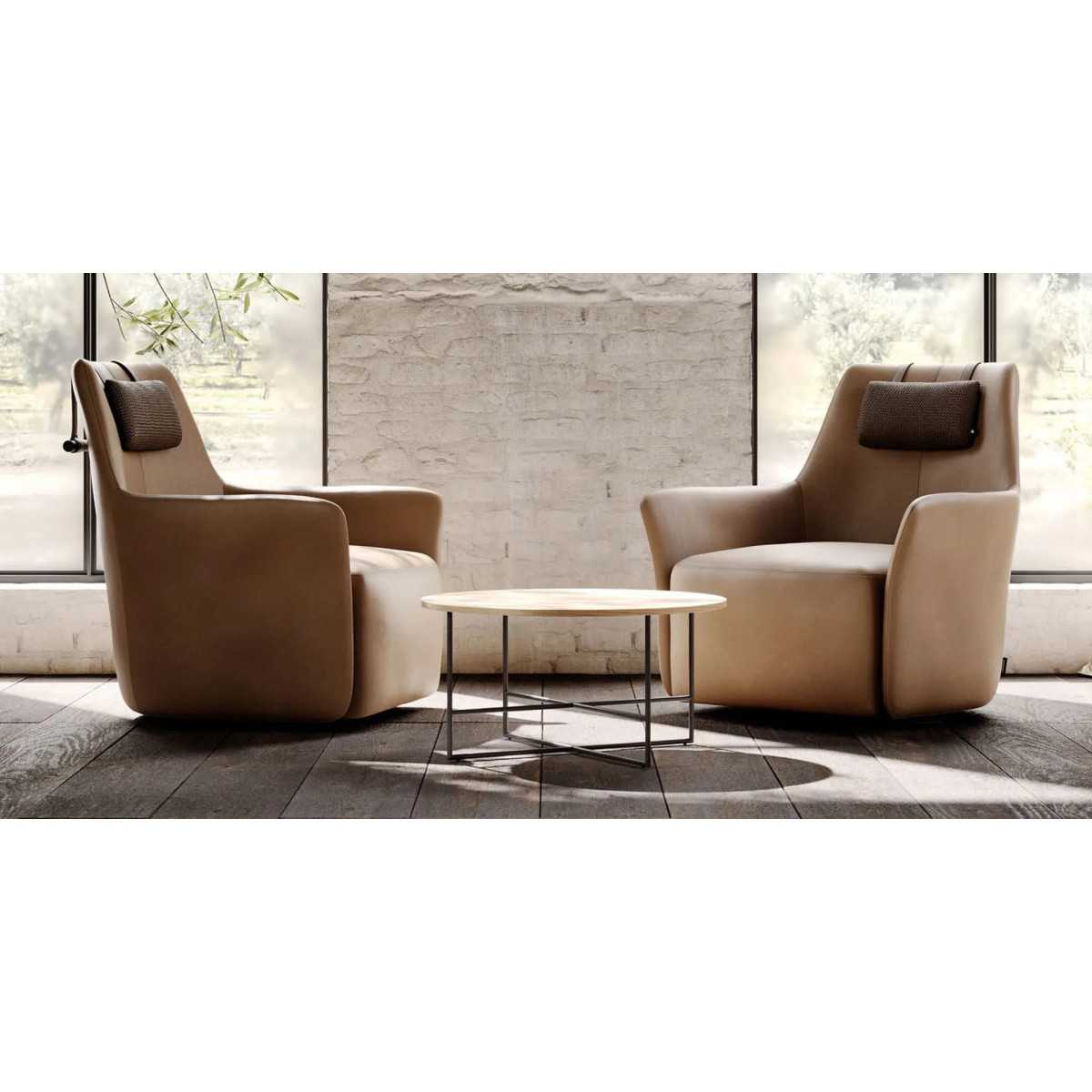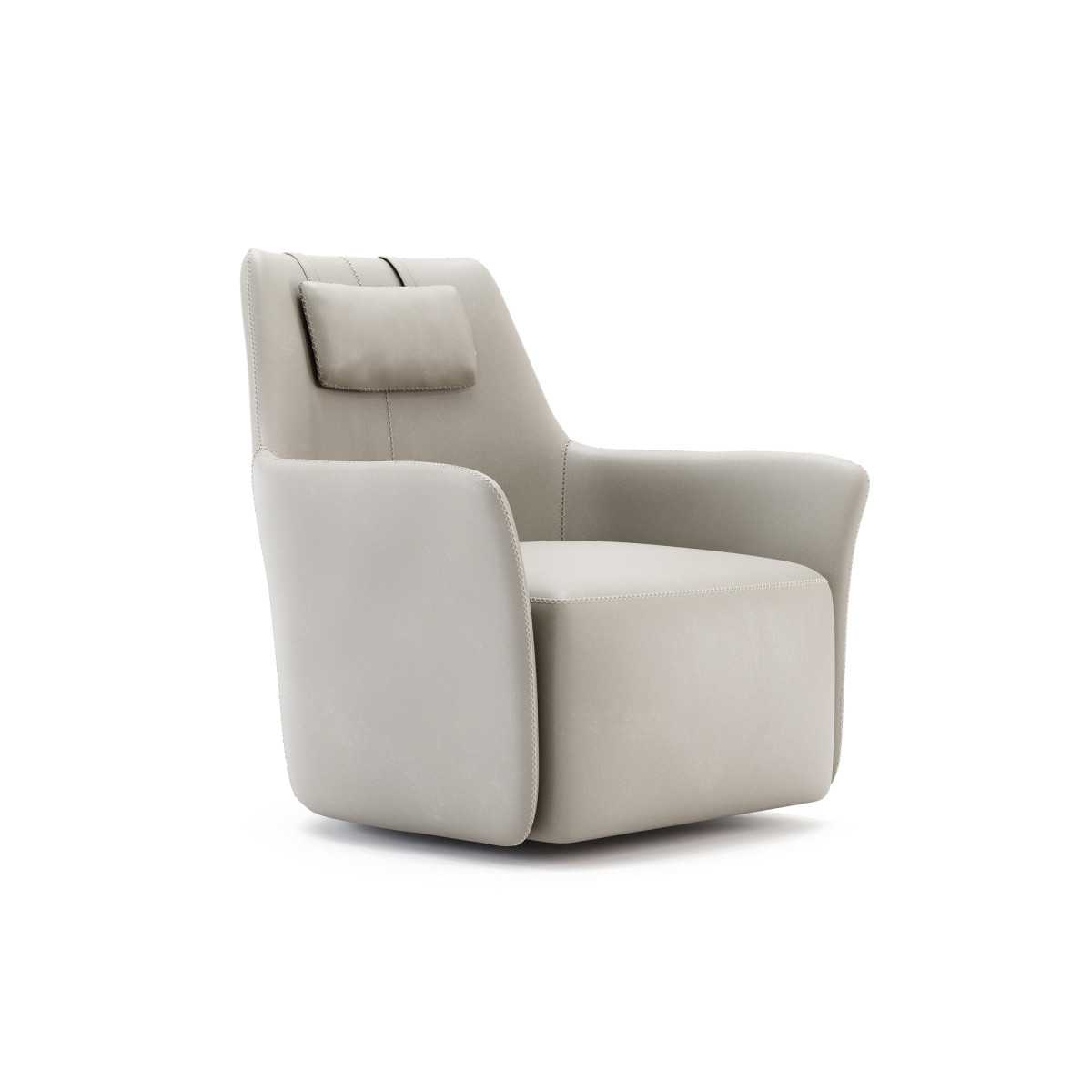 Alexander es una solución muy innovadora relacionada con una forma funcional y bastante tradicional. Una estructura potente y envolvente donde un respaldo alto se conecta suavemente al cojín del asiento y termina en una base giratoria.