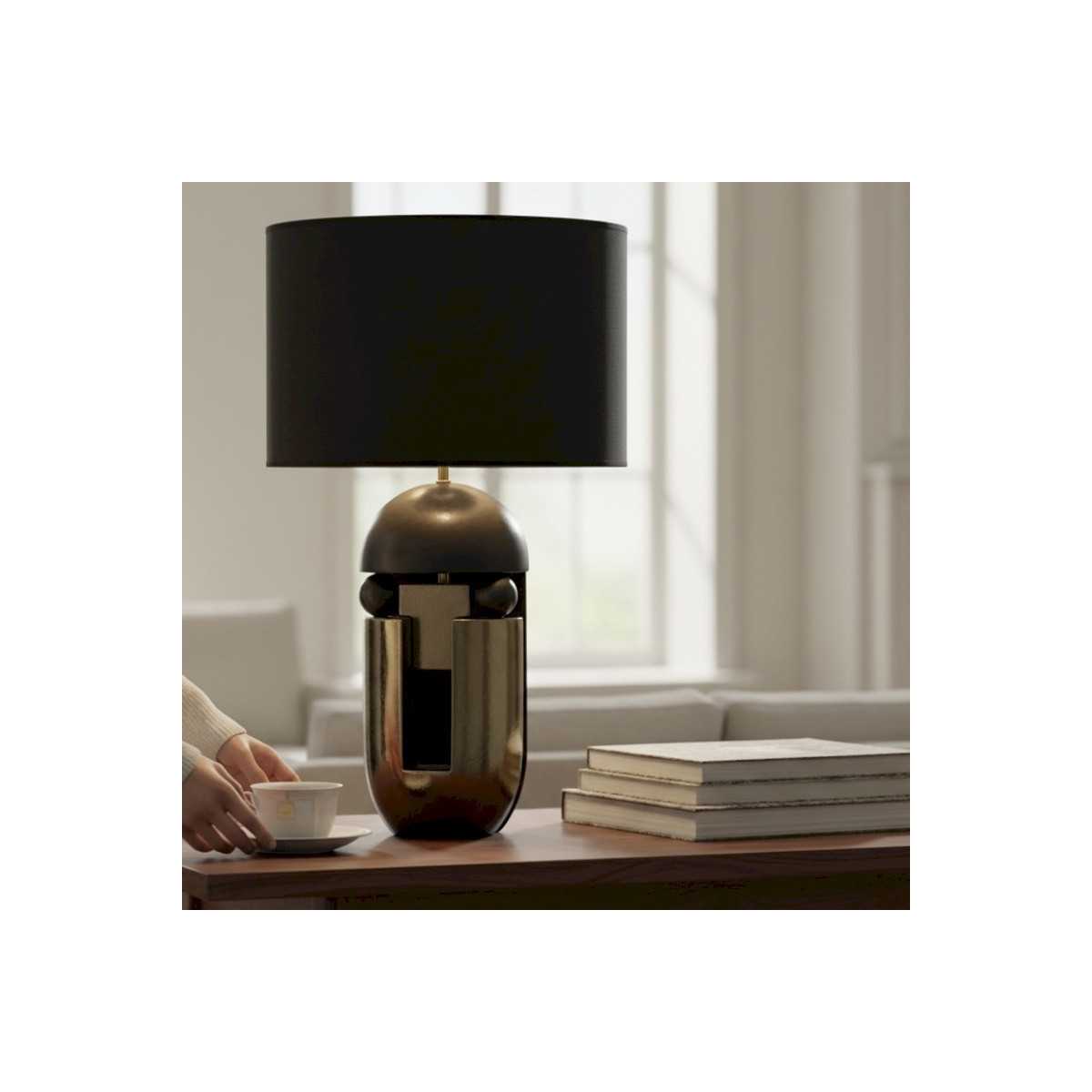 Lampe NAZCA noir et or signée Drimmer, luminaire décoratif design au style contemporain et sophistiqué. Cette lampe haut de gamme associe finitions noir profond et touches dorées pour créer une ambiance chic et chaleureuse. Idéale pour illuminer un salon, une chambre ou un bureau, elle s’intègre parfaitement dans une décoration intérieure moderne, élégante ou luxe.
