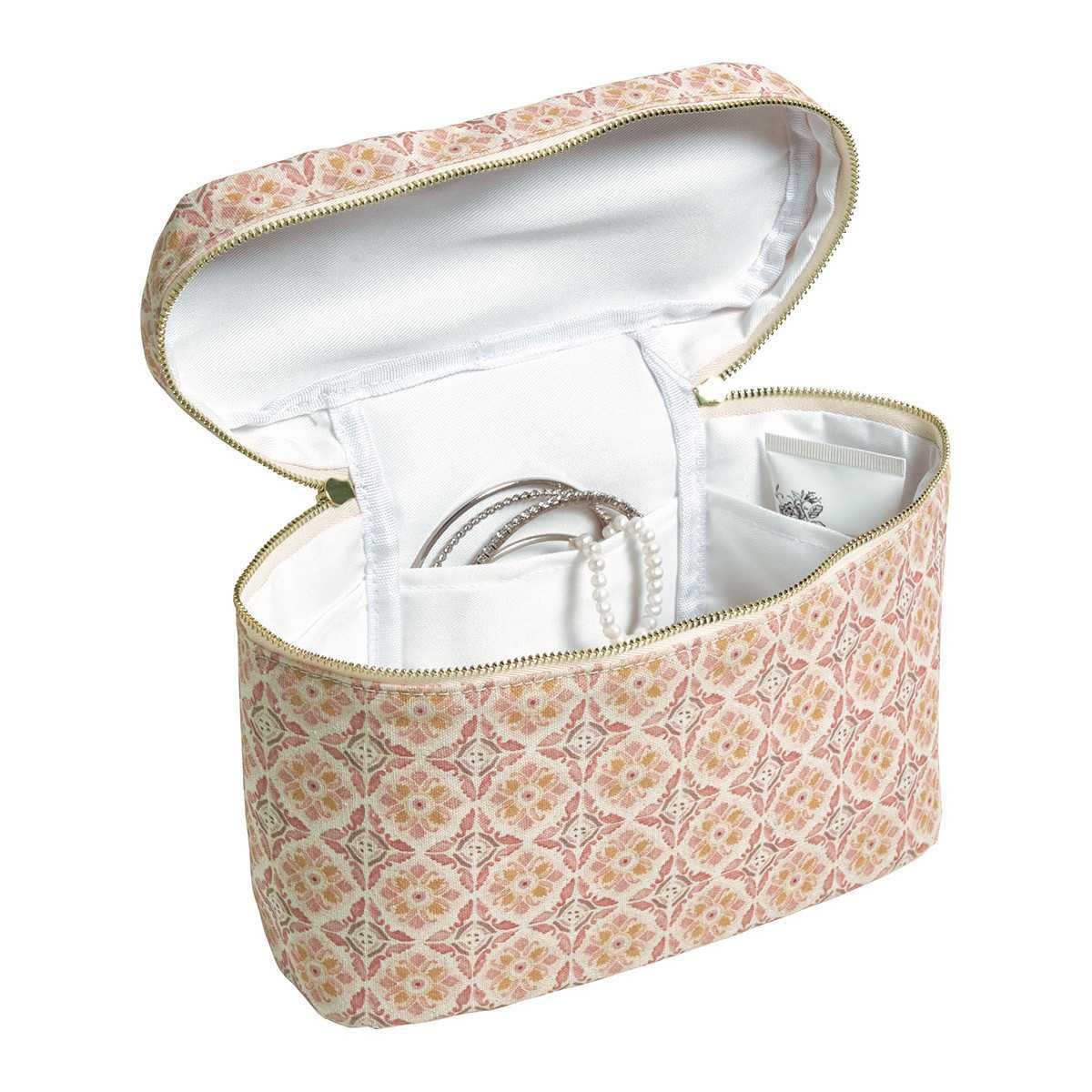 Accessoire indispensable de vos voyages, ce vanity arbore un décor élégant et raffiné, inspiré des traditionnels azulejos portugais. Facile à glisser dans les bagages, il permet d'emporter partout avec vous votre maquillage, vos bijoux ou encore vos produits de beauté.