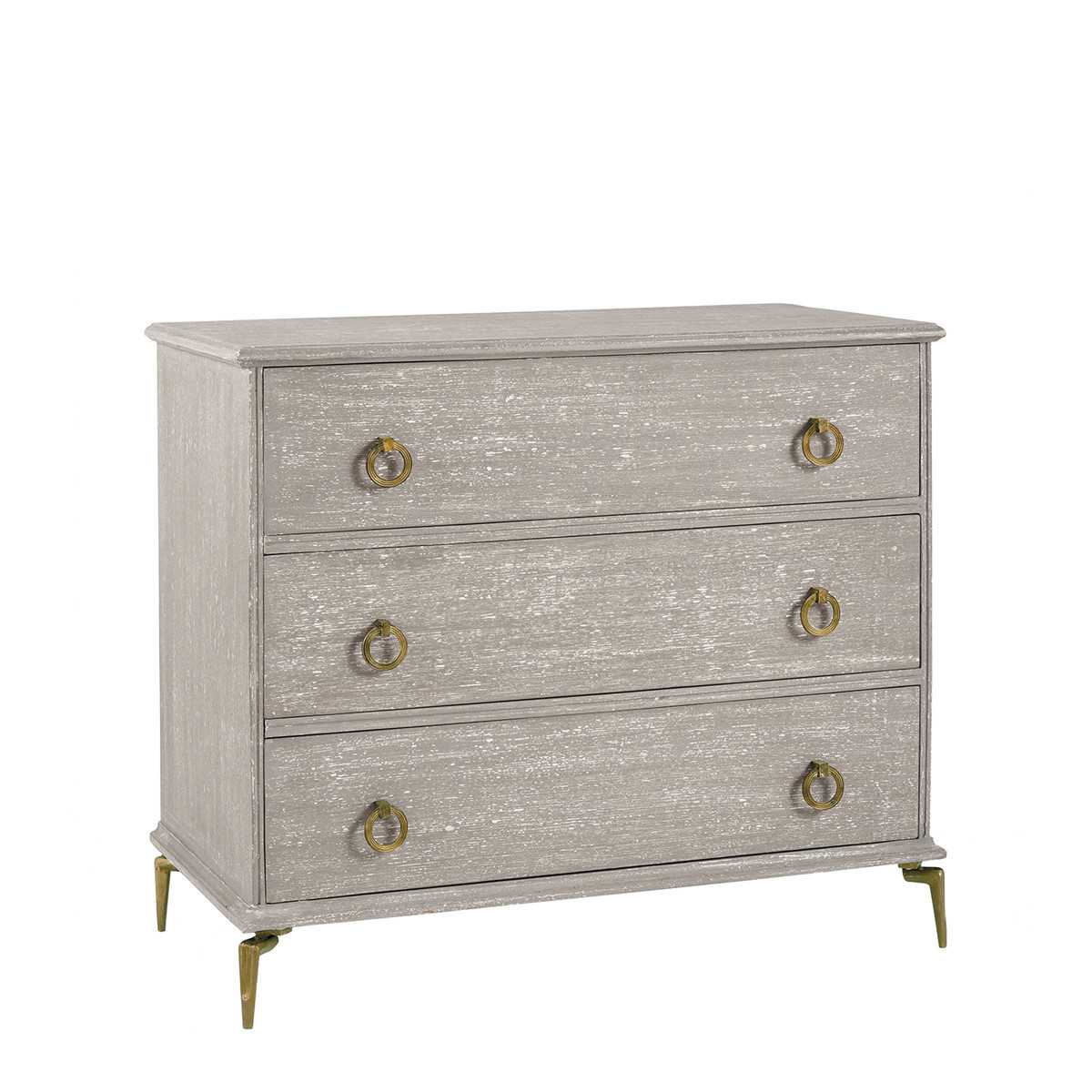 Interamente realizzate a mano, le curve classiche della cassettiera GABRIELLE mango sono sublimate da una patina grigia artigianale e dai tocchi di ottone brillante dei piedi e dei polsi.