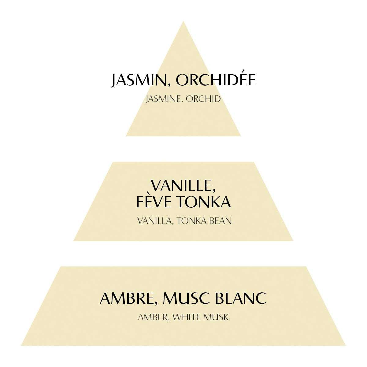 Croccante e coinvolgente, questa calda fragranza rivela un accordo floreale di orchidea impreziosito da una squisita nota salina. Nel cuore, la crema alla vaniglia si fonde con la morbida fava tonka. Gelsomino, Orchidea
