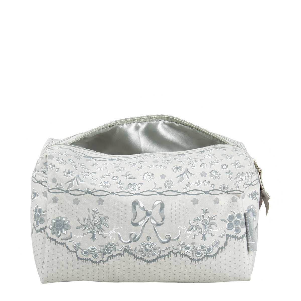 Questo raffinato arredamento ora adorna la borsa da toilette rettangolare Dentelle Aquarelle, un accessorio indispensabile per accompagnarti in movimento. Il suo formato molto comodo ti permetterà di infilarlo facilmente in una valigia o una borsa da viaggio.