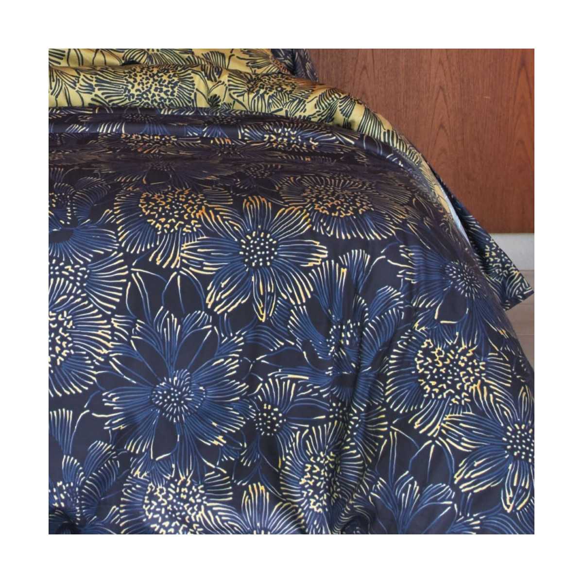 Gemaakt in Gérardmer van een uitzonderlijk fijne katoensatijn met een dichte, zijdezachte draaddichtheid van 120, biedt het een luxueus gevoel en absoluut comfort. De voorzijde heeft een diep indigo achtergrond, versterkt door een chique en weelderige lijntekening, terwijl de gouden achterzijde dezelfde motieven onthult in een kostbare en stralende interpretatie.