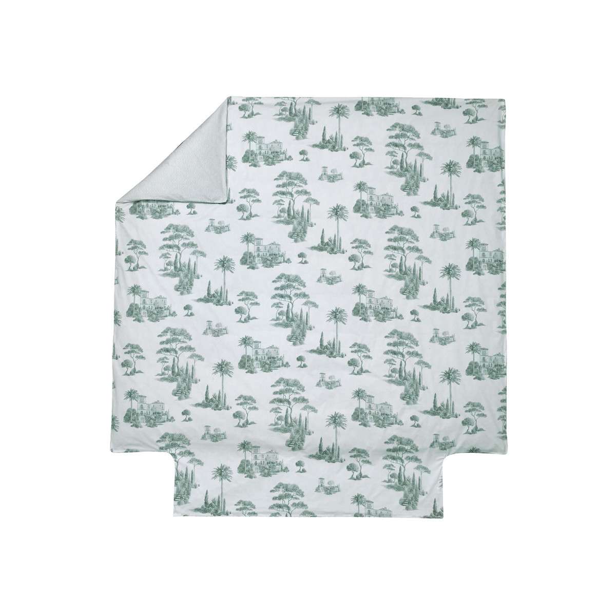 Dekbedovertrek 200x200 cm, 100% gekamd katoenen percale, 80 draden/cm². Het Promenade Sage dekbedovertrek combineert op elegante wijze traditie en moderniteit. Gedrukt op katoenen percal, is aan één zijde een fijn gegraveerd motief in saliegroene tinten te zien, geïnspireerd op de Toile de Jouy, wat de poëzie van een landelijke wandeling oproept.